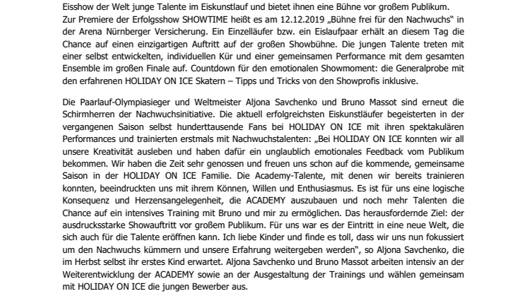 Zur Premiere der Erfolgsshow SHOWTIME heißt es am 12.12.2019 „Bühne frei für den Nachwuchs“ in der Arena Nürnberger Versicherung. Ein Einzelläufer bzw. ein Eislaufpaar erhält an diesem Tag die Chance auf einen einzigartigen Auftritt auf der großen Showbühne. Die jungen Talente treten mit einer selbst entwickelten, individuellen Kür und einer gemeinsamen Performance mit dem gesamten Ensemble im großen Finale auf. Countdown für den emotionalen Showmoment: die Generalprobe mit den erfahrenen HOLIDAY ON ICE Skatern – Tipps und Tricks von den Showprofis inklusive.