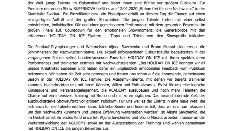 Hamburg/Zwickau, 6. Juni 2019 – Mit der HOLIDAY ON ICE ACADEMY fördert die größte Eisshow der Welt junge Talente im Eiskunstlauf und bietet ihnen eine Bühne vor großem Publikum. Zur Premiere der neuen Show SUPERNOVA heißt es am 12.02.2020 „Bühne frei für den Nachwuchs“ in der Stadthalle Zwickau. Ein Einzelläufer bzw. ein Eislaufpaar erhält an diesem Tag die Chance auf einen einzigartigen Auftritt auf der großen Showbühne. Die jungen Talente treten mit einer selbst entwickelten, individuellen Kür und einer gemeinsamen Performance mit dem gesamten Ensemble im großen Finale auf. Countdown für den emotionalen Showmoment: die Generalprobe mit den erfahrenen HOLIDAY ON ICE Skatern – Tipps und Tricks von den Showprofis inklusive.