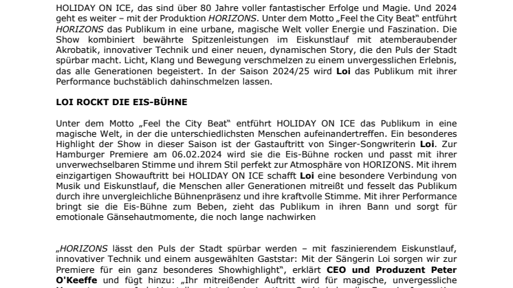 Mit der Produktion HORIZONS startet HOLIDAY ON ICE in dieser Saison in ein neues Kapitel magischer Eisshows. Ab November tourt die Show durch 22 deutsche Städte und verspricht ein einzigartiges Erlebnis, das die pulsierende Energie der Großstadt auf das Eis bringt. Vom 06. bis 09.02.2025 gastiert die Show in Hamburg mit einem besonderen Highlight: Bei der Premiere in der Barclays Arena wird Singer-Songwriterin Loi als Gaststar live auftreten und die Show durch ihre musikalische Performance bereichern.