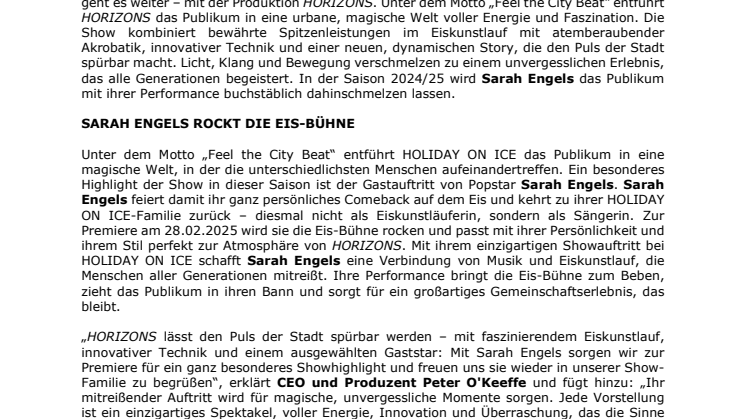 „HORIZONS lässt den Puls der Stadt spürbar werden – mit faszinierendem Eiskunstlauf, innovativer Technik und einem ausgewählten Gaststar: Mit Sarah Engels sorgen wir zur Premiere für ein ganz besonderes Showhighlight und freuen uns sie wieder in unserer Show-Familie zu begrüßen“, erklärt CEO und Produzent Peter O'Keeffe und fügt hinzu: „Ihr mitreißender Auftritt wird für magische, unvergessliche Momente sorgen. Jede Vorstellung ist ein einzigartiges Spektakel, voller Energie, Innovation und Überraschung, das die Sinne fesselt."