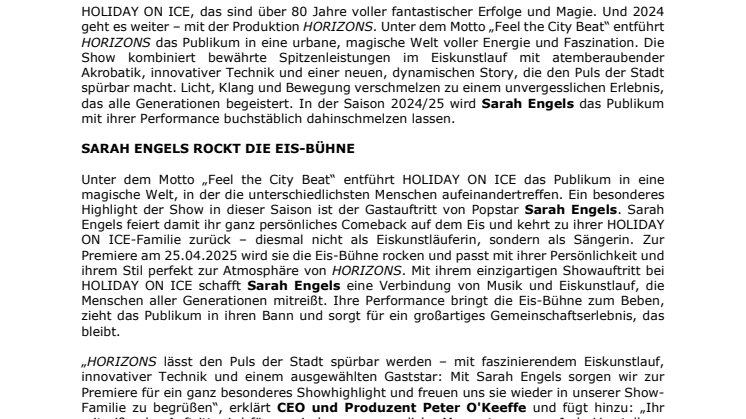 „HORIZONS lässt den Puls der Stadt spürbar werden – mit faszinierendem Eiskunstlauf, innovativer Technik und einem ausgewählten Gaststar: Mit Sarah Engels sorgen wir zur Premiere für ein ganz besonderes Showhighlight und freuen uns sie wieder in unserer Show-Familie zu begrüßen“, erklärt CEO und Produzent Peter O'Keeffe und fügt hinzu: „Ihr mitreißender Auftritt wird für magische, unvergessliche Momente sorgen. Jede Vorstellung ist ein einzigartiges Spektakel, voller Energie, Innovation und Überraschung, das die Sinne fesselt."