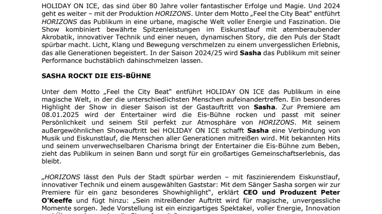 „HORIZONS lässt den Puls der Stadt spürbar werden – mit faszinierendem Eiskunstlauf, innovativer Technik und einem ausgewählten Gaststar: Mit dem Sänger Sasha sorgen wir zur Premiere für ein ganz besonderes Showhighlight“, erklärt CEO und Produzent Peter O'Keeffe und fügt hinzu: „Sein mitreißender Auftritt wird für magische, unvergessliche Momente sorgen. Jede Vorstellung ist ein einzigartiges Spektakel, voller Energie, Innovation und Überraschung, das die Sinne fesselt."
