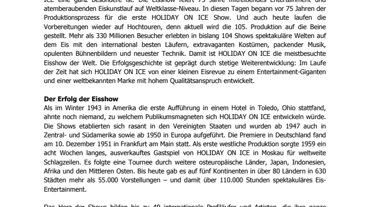 Mit mehr als 330 Millionen Besuchern ist HOLIDAY ON ICE die meistbesuchte Eisshow der Welt. Bis heute, fast 75 Jahre nach der ersten Vorstellung im Dezember 1943, hat sich der Publikumsmagnet von einer kleinen Hotelproduktion in den USA zu einem global agierenden Eis-Entertainment-Produzenten entwickelt. Bereits 1951 eroberte HOLIDAY ON ICE Europa und feierte im gleichen Jahr die erste Deutschlandpremiere in Frankfurt am Main. Das Original aller Eiskunstshows präsentiert Eiskunstlauf auf höchstem Leistungsniveau mit Elementen aus Theater, Tanz, Oper, Pop, Magie, Musical und Akrobatik. Auch in Zukunft entstehen begeisternde und innovative Produktionen, die jede Saison mit rund 65 Eiskunstläufern in mehr als 45 Städten gastieren.