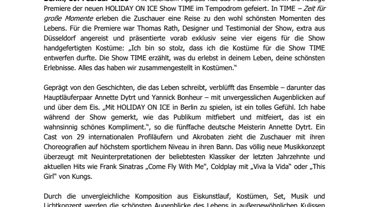 Berlin, 21. Februar 2018 – Mit tosendem Applaus hat das Publikum in Berlin die heutige Premiere der neuen HOLIDAY ON ICE Show TIME im Tempodrom gefeiert. In TIME – Zeit für große Momente erleben die Zuschauer eine Reise zu den wohl schönsten Momenten des Lebens. Für die Premiere war Thomas Rath, Designer und Testimonial der Show, extra aus Düsseldorf angereist und präsentierte vorab exklusiv seine vier eigens für die Show handgefertigten Kostüme: „Ich bin so stolz, dass ich die Kostüme für die Show TIME entwerfen durfte. Die Show TIME erzählt, was du erlebst in deinem Leben, deine schönsten Erlebnisse. Alles das haben wir zusammengestellt in Kostümen.“