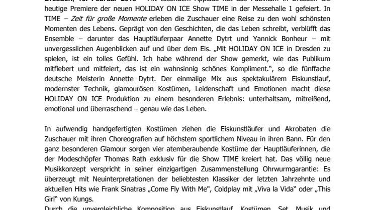 Dresden, 15. Februar 2018 – Mit tosendem Applaus hat das Publikum in Dresden die heutige Premiere der neuen HOLIDAY ON ICE Show TIME in der Messehalle 1 gefeiert. In TIME – Zeit für große Momente erleben die Zuschauer eine Reise zu den wohl schönsten Momenten des Lebens. Geprägt von den Geschichten, die das Leben schreibt, verblüfft das Ensemble – darunter das Hauptläuferpaar Annette Dytrt und Yannick Bonheur – mit unvergesslichen Augenblicken auf und über dem Eis. „Mit HOLIDAY ON ICE in Dresden zu spielen, ist ein tolles Gefühl. Ich habe während der Show gemerkt, wie das Publikum mitfiebert und mitfeiert, das ist ein wahnsinnig schönes Kompliment.“, so die fünffache deutsche Meisterin Annette Dytrt. Der einmalige Mix aus spektakulärem Eiskunstlauf, modernster Technik, glamourösen Kostümen, Leidenschaft und Emotionen macht diese HOLIDAY ON ICE Produktion zu einem besonderen Erlebnis: unterhaltsam, mitreißend, emotional und überraschend – genau wie das Leben.