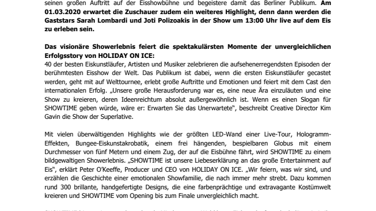 SHOWTIME bietet eine atemberaubende Mischung aus Weltklasse-Eiskunstlauf, spektakulärer Artistik, hochmoderner Bühnentechnik und fantasievollen Kostümdesigns und verspricht Entertainment der Extraklasse – sportlich, künstlerisch und technisch. Die Erfolgsproduktion erreichte in der vergangenen Saison Bestwerte in der Besucherzufriedenheit und ist seit heute Abend auch in Berlin zu erleben. Alle Eiskunstlauf-Liebhaber, HOLIDAY ON ICE Begeisterte und jeder, der neugierig geworden ist, können sich jetzt noch einen der begehrten Plätze sichern.