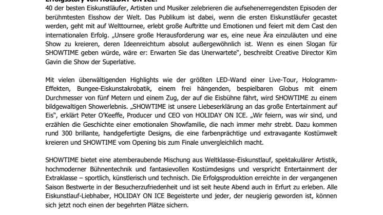 SHOWTIME bietet eine atemberaubende Mischung aus Weltklasse-Eiskunstlauf, spektakulärer Artistik, hochmoderner Bühnentechnik und fantasievollen Kostümdesigns und verspricht Entertainment der Extraklasse – sportlich, künstlerisch und technisch. Die Erfolgsproduktion erreichte in der vergangenen Saison Bestwerte in der Besucherzufriedenheit und ist seit heute Abend auch in Erfurt zu erleben. Alle Eiskunstlauf-Liebhaber, HOLIDAY ON ICE Begeisterte und jeder, der neugierig geworden ist, können sich jetzt noch einen der begehrten Plätze sichern.