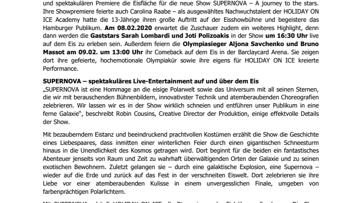 Hamburg – HOLIDAY ON ICE eröffnete heute in der Barclaycard Arena mit einer emotionsgeladenen und spektakulären Premiere die Eisfläche für die neue Show SUPERNOVA – A journey to the stars. Ihre Showpremiere feierte auch Carolina Raabe – als ausgewähltes Nachwuchstalent der HOLIDAY ON ICE Academy hatte die 13-Jährige ihren große Auftritt auf der Eisshowbühne und begeistere das Hamburger Publikum. Am 08.02.2020 erwartet die Zuschauer zudem ein weiteres Highlight, denn dann werden die Gaststars Sarah Lombardi und Joti Polizoakis in der Show um 16:30 Uhr live auf dem Eis zu erleben sein. Außerdem feiern die Olympiasieger Aljona Savchenko und Bruno Massot am 09.02. um 13:00 Uhr ihr Comeback auf dem Eis in der Barclaycard Arena. Sie zeigen dort ihre gefeierte, hochemotionale Olympiakür sowie ihre eigens für HOLIDAY ON ICE kreierte Performance.