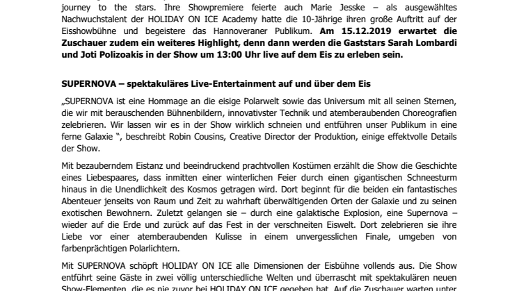 Hamburg/Hannover – HOLIDAY ON ICE eröffnete heute in der TUI Arena mit einer emotionsgeladenen und spektakulären Premiere die Eisfläche für die neue Show SUPERNOVA – A journey to the stars. Ihre Showpremiere feierte auch Marie Jesske – als ausgewähltes Nachwuchstalent der HOLIDAY ON ICE Academy hatte die 10-Jährige ihren große Auftritt auf der Eisshowbühne und begeistere das Hannoveraner Publikum. Am 15.12.2019 erwartet die Zuschauer zudem ein weiteres Highlight, denn dann werden die Gaststars Sarah Lombardi und Joti Polizoakis in der Show um 13:00 Uhr live auf dem Eis zu erleben sein.
