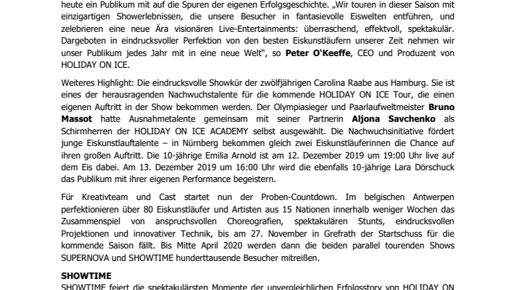 Für Kreativteam und Cast startet nun der Proben-Countdown. Im belgischen Antwerpen perfektionieren über 80 Eiskunstläufer und Artisten aus 15 Nationen innerhalb weniger Wochen das Zusammenspiel von anspruchsvollen Choreografien, spektakulären Stunts, eindrucksvollen Projektionen und innovativer Technik, bis am 27. November in Grefrath der Startschuss für die kommende Saison fällt. Bis Mitte April 2020 werden dann die beiden parallel tourenden Shows SUPERNOVA und SHOWTIME hunderttausende Besucher mitreißen.