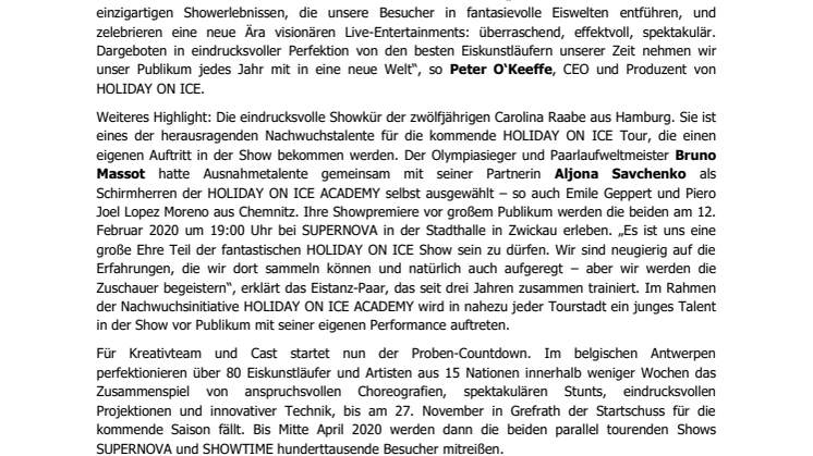 Weiteres Highlight: Die eindrucksvolle Showkür der zwölfjährigen Carolina Raabe aus Hamburg. Sie ist eines der herausragenden Nachwuchstalente für die kommende HOLIDAY ON ICE Tour, die einen eigenen Auftritt in der Show bekommen werden. Der Olympiasieger und Paarlaufweltmeister Bruno Massot hatte Ausnahmetalente gemeinsam mit seiner Partnerin Aljona Savchenko als Schirmherren der HOLIDAY ON ICE ACADEMY selbst ausgewählt – so auch Emile Geppert und Piero Joel Lopez Moreno aus Chemnitz. Ihre Showpremiere vor großem Publikum werden die beiden am 12. Februar 2020 um 19:00 Uhr bei SUPERNOVA in der Stadthalle in Zwickau erleben. „Es ist uns eine große Ehre Teil der fantastischen HOLIDAY ON ICE Show sein zu dürfen. Wir sind neugierig auf die Erfahrungen, die wir dort sammeln können und natürlich auch aufgeregt – aber wir werden die Zuschauer begeistern“, erklärt das Eistanz-Paar, das seit drei Jahren zusammen trainiert. Im Rahmen der Nachwuchsinitiative HOLIDAY ON ICE ACADEMY wird in nahezu jeder Tourstadt ein junges Talent in der Show vor Publikum mit seiner eigenen Performance auftreten.