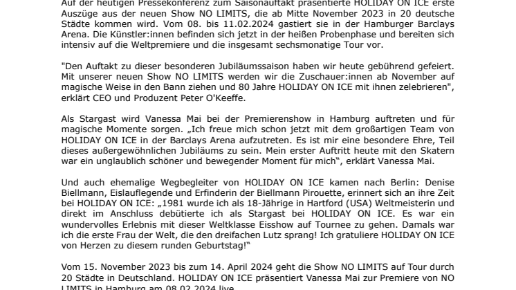 Auf der heutigen Pressekonferenz zum Saisonauftakt präsentierte HOLIDAY ON ICE erste Auszüge aus der neuen Show NO LIMITS, die ab Mitte November 2023 in 20 deutsche Städte kommen wird. Vom 08. bis 11.02.2024 gastiert sie in der Hamburger Barclays Arena. Die Künstler:innen befinden sich jetzt in der heißen Probenphase und bereiten sich intensiv auf die Weltpremiere und die insgesamt sechsmonatige Tour vor.