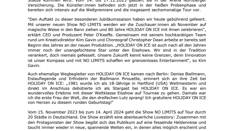 "Den Auftakt zu dieser besonderen Jubiläumssaison haben wir heute gebührend gefeiert. Mit unserer neuen Show NO LIMITS werden wir die Zuschauer:innen ab November auf magische Weise in den Bann ziehen und 80 Jahre HOLIDAY ON ICE mit ihnen zelebrieren", erklärt CEO und Produzent Peter O'Keeffe. Gemeinsam mit seinem hochkarätigen Team rund um Kreativdirektor Kim Gavin und Choreograf Christopher Dean arbeite er bereits seit Beginn des Jahres an der neuen Produktion. „HOLIDAY ON ICE ist auch nach all den Jahren immer noch der unangefochtene Star unter den Eisshows. Wir sind in der Tradition verankert, doch niemals gefesselt. Unsere Zukunft kennt keine Grenzen, denn Innovation ist unser Kompass und mit NO LIMITS schaffen wir grenzenloses Entertainment“, so Kim Gavin.