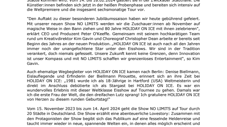 "Den Auftakt zu dieser besonderen Jubiläumssaison haben wir heute gebührend gefeiert. Mit unserer neuen Show NO LIMITS werden wir die Zuschauer:innen ab November auf magische Weise in den Bann ziehen und 80 Jahre HOLIDAY ON ICE mit ihnen zelebrieren", erklärt CEO und Produzent Peter O'Keeffe. Gemeinsam mit seinem hochkarätigen Team rund um Kreativdirektor Kim Gavin und Choreograf Christopher Dean arbeite er bereits seit Beginn des Jahres an der neuen Produktion. „HOLIDAY ON ICE ist auch nach all den Jahren immer noch der unangefochtene Star unter den Eisshows. Wir sind in der Tradition verankert, doch niemals gefesselt. Unsere Zukunft kennt keine Grenzen, denn Innovation ist unser Kompass und mit NO LIMITS schaffen wir grenzenloses Entertainment“, so Kim Gavin.