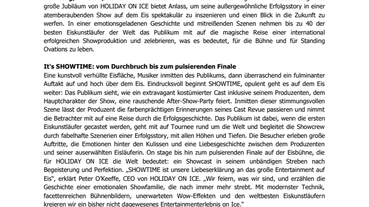 Eine kunstvoll verhüllte Eisfläche, Musiker inmitten des Publikums, dann überraschend ein fulminanter Auftakt auf und hoch über dem Eis. Eindrucksvoll beginnt SHOWTIME, opulent geht es auf dem Eis weiter: Das Publikum sieht, wie ein extravagant kostümierter Cast inklusive seinem Produzenten, dem Hauptcharakter der Show, eine rauschende After-Show-Party feiert. Inmitten dieser stimmungsvollen Szene lässt der Produzent die farbenprächtigen Erinnerungen seines Cast Revue passieren und nimmt die Betrachter mit auf eine Reise durch die Erfolgsgeschichte. Das Publikum ist dabei, wenn die ersten Eiskunstläufer gecastet werden, geht mit auf Tournee rund um die Welt und begleitet die Showcrew durch fabelhafte Szenerien einer Erfolgsstory, mit allen Höhen und Tiefen. Die Besucher erleben große Auftritte, die Emotionen hinter den Kulissen und eine Liebesgeschichte zwischen dem Produzenten und seiner auserwählten Eisläuferin. On stage bis hin zum pulsierenden Finale auf der Eisbühne, die für HOLIDAY ON ICE die Welt bedeutet: ein Showcast in seinem unbändigen Streben nach Begeisterung und Perfektion. „SHOWTIME ist unsere Liebeserklärung an das große Entertainment auf Eis“, erklärt Peter O’Keeffe, CEO von HOLIDAY ON ICE. „Wir feiern, was wir sind, und erzählen die Geschichte einer emotionalen Showfamilie, die nach immer mehr strebt. Mit modernster Technik, facettenreichen Bühnenbildern, unerwarteten Wow-Effekten und den weltbesten Eiskunstläufern kreieren wir ein bisher nicht dagewesenes Entertainmenterlebnis on Ice.“