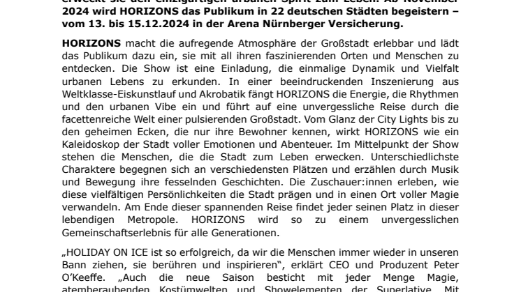„HOLIDAY ON ICE ist so erfolgreich, da wir die Menschen immer wieder in unseren Bann ziehen, sie berühren und inspirieren“, erklärt CEO und Produzent Peter O’Keeffe. „Auch die neue Saison besticht mit jeder Menge Magie, atemberaubenden Kostümwelten und Showelementen der Superlative. Mit HORIZONS erschaffen wir eine neue Welt auf dem Eis – es ist eine Hommage an die aufregende Atmosphäre und Diversität der Stadt, die in jeder Szene spürbar ist.“