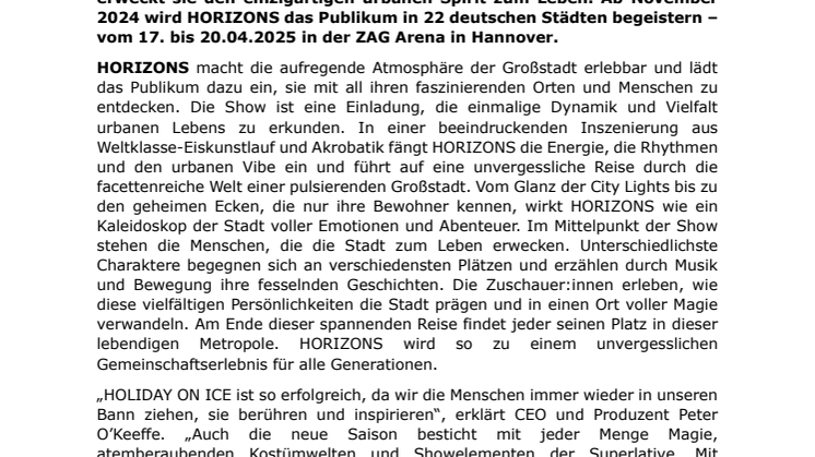 „HOLIDAY ON ICE ist so erfolgreich, da wir die Menschen immer wieder in unseren Bann ziehen, sie berühren und inspirieren“, erklärt CEO und Produzent Peter O’Keeffe. „Auch die neue Saison besticht mit jeder Menge Magie, atemberaubenden Kostümwelten und Showelementen der Superlative. Mit HORIZONS erschaffen wir eine neue Welt auf dem Eis – es ist eine Hommage an die aufregende Atmosphäre und Diversität der Stadt, die in jeder Szene spürbar ist.“