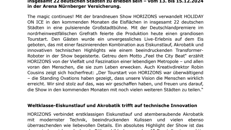 The magic continues! Mit der brandneuen Show HORIZONS verwandelt HOLIDAY ON ICE in den kommenden Monaten die Eisflächen in insgesamt 22 deutschen Städten in eine pulsierende Großstadtbühne. Mit der Deutschlandpremiere im nordrheinwestfälischen Grefrath feierte die Produktion heute einen grandiosen Tourstart. Den Gästen wurde ein unvergessliches Live-Erlebnis auf dem Eis geboten, das mit einer faszinierenden Kombination aus Eiskunstlauf, Akrobatik und innovativen technischen Highlights wie einem beeindruckenden Transformer-Roboter in der Show begeisterte. Getreu dem Motto „Feel the City Beat“ erzählt HORIZONS von der Vielfalt und Faszination einer lebendigen Metropole – und allen voran den Menschen, die sie zum Leben erwecken. Auch Kreativdirektor Robin Cousins zeigt sich hocherfreut: „Der Tourstart von HORIZONS war überwältigend – die Standing Ovations haben gezeigt, dass unsere Vision die Menschen wirklich erreicht. Wir sind stolz auf das, was wir geschaffen haben, und freuen uns darauf, die Show in den kommenden Monaten mit noch vielen weiteren Städten zu teilen.“