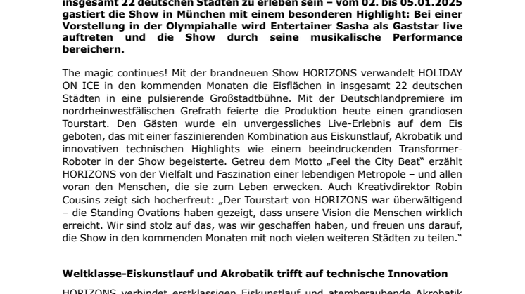 Der Tourstart von HOLIDAY ON ICE – HORIZONS war ein voller Erfolg! Die heutige Premiere begeisterte das Publikum mit einer grandiosen Show und erntete viel Applaus. Unter dem Motto „Feel the City Beat!“ zog die hochwertige Produktion die Zuschauer:innen mit der Energie, der Bewegung und dem Sound einer pulsierenden Großstadt in den Bann. Schon vor dem offiziellen Beginn der Tour konnte HOLIDAY ON ICE einen beeindruckenden Erfolg verzeichnen: Über 200.000 Tickets wurden für diese Saison bereits verkauft. Bis Ende April 2025 wird HORIZONS in insgesamt 22 deutschen Städten zu erleben sein – vom 02. bis 05.01.2025 gastiert die Show in München mit einem besonderen Highlight: Bei einer Vorstellung in der Olympiahalle wird Entertainer Sasha als Gaststar live auftreten und die Show durch seine musikalische Performance bereichern.