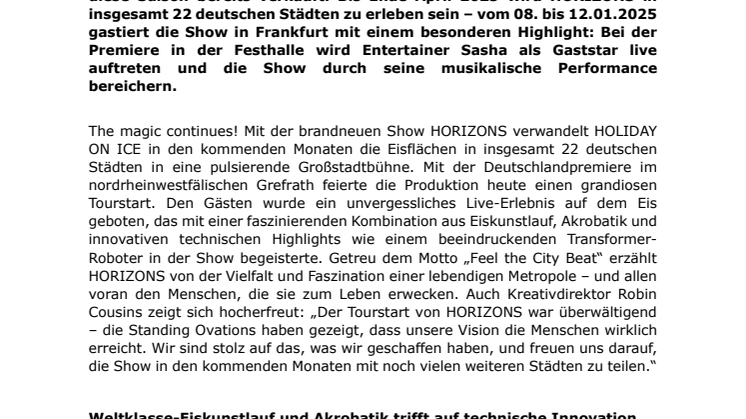 Der Tourstart von HOLIDAY ON ICE – HORIZONS war ein voller Erfolg! Die heutige Premiere begeisterte das Publikum mit einer grandiosen Show und erntete viel Applaus. Unter dem Motto „Feel the City Beat!“ zog die hochwertige Produktion die Zuschauer:innen mit der Energie, der Bewegung und dem Sound einer pulsierenden Großstadt in den Bann. Schon vor dem offiziellen Beginn der Tour konnte HOLIDAY ON ICE einen beeindruckenden Erfolg verzeichnen: Über 200.000 Tickets wurden für diese Saison bereits verkauft. Bis Ende April 2025 wird HORIZONS in insgesamt 22 deutschen Städten zu erleben sein – vom 08. bis 12.01.2025 gastiert die Show in Frankfurt mit einem besonderen Highlight: Bei der Premiere in der Festhalle wird Entertainer Sasha als Gaststar live auftreten und die Show durch seine musikalische Performance bereichern.