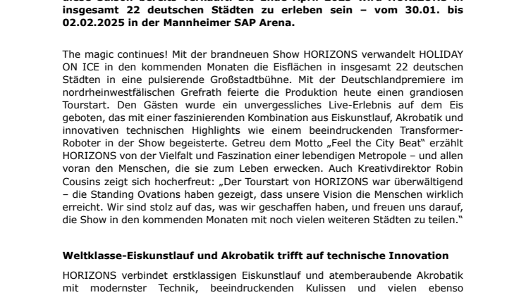The magic continues! Mit der brandneuen Show HORIZONS verwandelt HOLIDAY ON ICE in den kommenden Monaten die Eisflächen in insgesamt 22 deutschen Städten in eine pulsierende Großstadtbühne. Mit der Deutschlandpremiere im nordrheinwestfälischen Grefrath feierte die Produktion heute einen grandiosen Tourstart. Den Gästen wurde ein unvergessliches Live-Erlebnis auf dem Eis geboten, das mit einer faszinierenden Kombination aus Eiskunstlauf, Akrobatik und innovativen technischen Highlights wie einem beeindruckenden Transformer-Roboter in der Show begeisterte. Getreu dem Motto „Feel the City Beat“ erzählt HORIZONS von der Vielfalt und Faszination einer lebendigen Metropole – und allen voran den Menschen, die sie zum Leben erwecken. Auch Kreativdirektor Robin Cousins zeigt sich hocherfreut: „Der Tourstart von HORIZONS war überwältigend – die Standing Ovations haben gezeigt, dass unsere Vision die Menschen wirklich erreicht. Wir sind stolz auf das, was wir geschaffen haben, und freuen uns darauf, die Show in den kommenden Monaten mit noch vielen weiteren Städten zu teilen.“