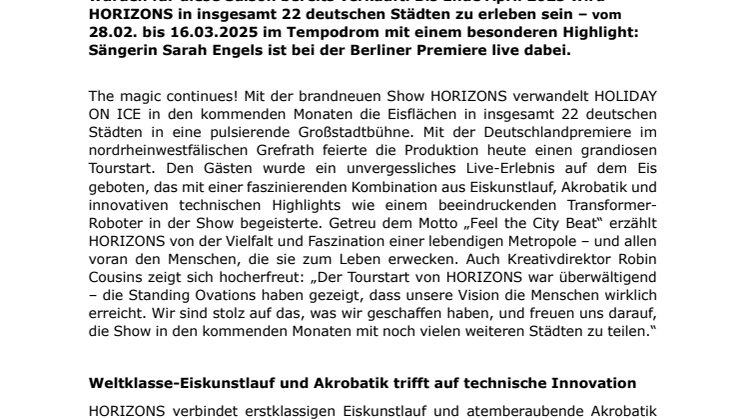 The magic continues! Mit der brandneuen Show HORIZONS verwandelt HOLIDAY ON ICE in den kommenden Monaten die Eisflächen in insgesamt 22 deutschen Städten in eine pulsierende Großstadtbühne. Mit der Deutschlandpremiere im nordrheinwestfälischen Grefrath feierte die Produktion heute einen grandiosen Tourstart. Den Gästen wurde ein unvergessliches Live-Erlebnis auf dem Eis geboten, das mit einer faszinierenden Kombination aus Eiskunstlauf, Akrobatik und innovativen technischen Highlights wie einem beeindruckenden Transformer-Roboter in der Show begeisterte. Getreu dem Motto „Feel the City Beat“ erzählt HORIZONS von der Vielfalt und Faszination einer lebendigen Metropole – und allen voran den Menschen, die sie zum Leben erwecken. Auch Kreativdirektor Robin Cousins zeigt sich hocherfreut: „Der Tourstart von HORIZONS war überwältigend – die Standing Ovations haben gezeigt, dass unsere Vision die Menschen wirklich erreicht. Wir sind stolz auf das, was wir geschaffen haben, und freuen uns darauf, die Show in den kommenden Monaten mit noch vielen weiteren Städten zu teilen.“