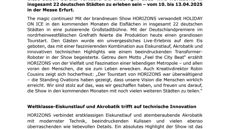 The magic continues! Mit der brandneuen Show HORIZONS verwandelt HOLIDAY ON ICE in den kommenden Monaten die Eisflächen in insgesamt 22 deutschen Städten in eine pulsierende Großstadtbühne. Mit der Deutschlandpremiere im nordrheinwestfälischen Grefrath feierte die Produktion heute einen grandiosen Tourstart. Den Gästen wurde ein unvergessliches Live-Erlebnis auf dem Eis geboten, das mit einer faszinierenden Kombination aus Eiskunstlauf, Akrobatik und innovativen technischen Highlights wie einem beeindruckenden Transformer-Roboter in der Show begeisterte. Getreu dem Motto „Feel the City Beat“ erzählt HORIZONS von der Vielfalt und Faszination einer lebendigen Metropole – und allen voran den Menschen, die sie zum Leben erwecken. Auch Kreativdirektor Robin Cousins zeigt sich hocherfreut: „Der Tourstart von HORIZONS war überwältigend – die Standing Ovations haben gezeigt, dass unsere Vision die Menschen wirklich erreicht. Wir sind stolz auf das, was wir geschaffen haben, und freuen uns darauf, die Show in den kommenden Monaten mit noch vielen weiteren Städten zu teilen.“