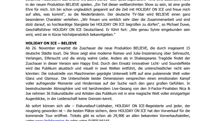 HOLIDAY ON ICE gibt Zusammenarbeit mit Sylvie Meis bekannt – Neue HOLIDAY ON ICE-Show BELIEVE zeigt rockige Romeo und Julia-Inszenierung mit Happy End – Sylvie Meis Teil der beliebten Eisshow – Tour ab 26. November durch 15 deutsche Städte – Vorverkauf eröffnet