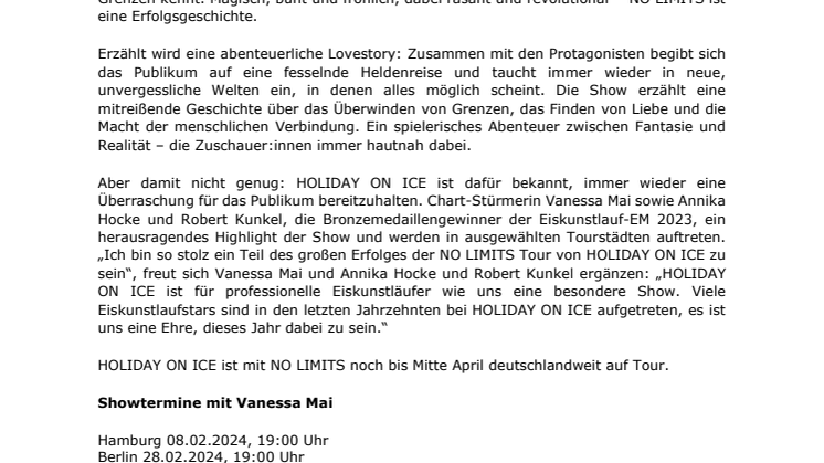 Aber damit nicht genug: HOLIDAY ON ICE ist dafür bekannt immer wieder eine Überraschung für das Publikum bereitzuhalten. Chart-Stürmerin Vanessa Mai sowie Annika Hocke und Robert Kunkel, die Bronzemedaillengewinner der Eiskunstlauf-EM 2023, ein herausragendes Highlight der Show und werden in ausgewählten Tourstädten auftreten. „Ich bin so stolz ein Teil des großen Erfolges der NO LIMITS Tour von HOLIDAY ON ICE zu sein“, freut sich Vanessa Mai und Annika Hocke und Robert Kunkel ergänzen: „HOLIDAY ON ICE ist für professionelle Eiskunstläufer wie uns eine besondere Show. Viele Eiskunstlaufstars sind in den letzten Jahrzehnten bei HOLIDAY ON ICE aufgetreten, es ist uns eine Ehre, dieses Jahr dabei zu sein.“