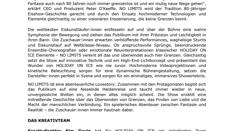 Die neue Show NO LIMITS ist ein weiterer Meilenstein in der 80-jährigen Geschichte. "HOLIDAY ON ICE genießt ein beeindruckendes internationales Renommee und schafft jedes Jahr in Zusammenarbeit mit etablierten Kreativen eine neue Welt auf dem Eis. Innovation ist unser Antrieb, um eine anspruchsvolle Generation von Zuschauer:innen zu begeistern“, so O'Keeffe.
