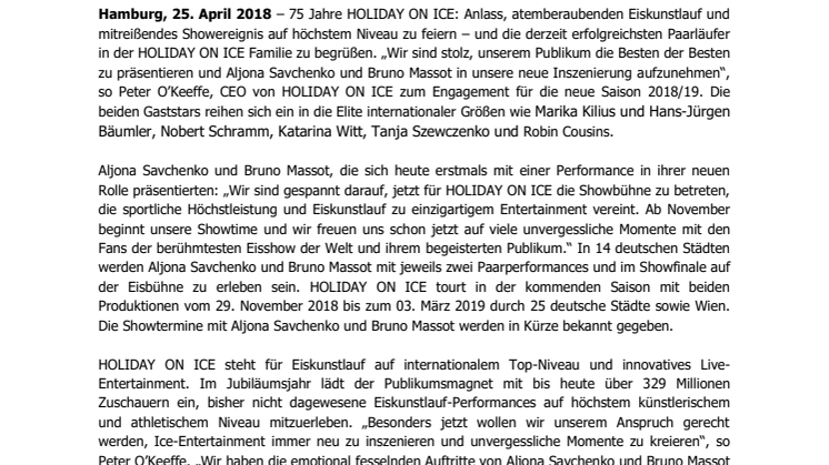 Hamburg, 25. April 2018– 75 Jahre HOLIDAY ON ICE: Anlass, atemberaubenden Eiskunstlauf und mitreißendes Showereignis auf höchstem Niveau zu feiern – und die derzeit erfolgreichsten Paarläufer in der HOLIDAY ON ICE Familie zu begrüßen. „Wir sind stolz, unserem Publikum die Besten der Besten zu präsentieren und Aljona Savchenko und Bruno Massot in unsere neue Inszenierung aufzunehmen“, so Peter O’Keeffe, CEO von HOLIDAY ON ICE zum Engagement für die neue Saison 2018/19. Die beiden Gaststars reihen sich ein in die Elite internationaler Größen wie Marika Kilius und Hans-Jürgen Bäumler, Nobert Schramm, Katarina Witt, Tanja Szewczenko und Robin Cousins.