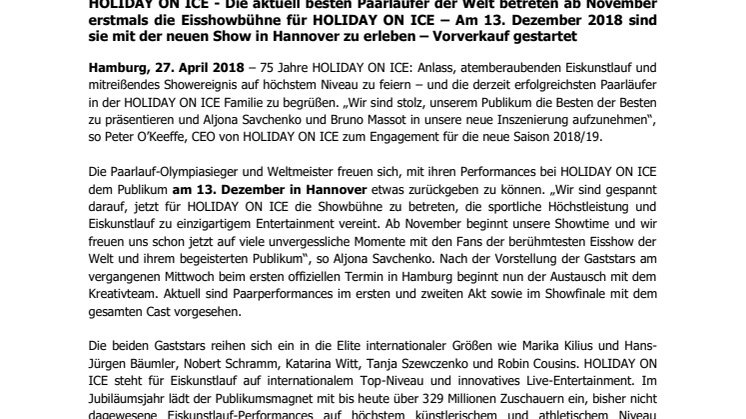Hannover feiert vom 13. bis 16. Dezember 2018 in der TUI Arena 75 Jahre HOLIDAY ON ICE - Die aktuell besten Paarläufer der Welt betreten ab November erstmals die Eisshowbühne für HOLIDAY ON ICE – Am 13. Dezember 2018 sind sie mit der neuen Show in Hannover zu erleben – Vorverkauf gestartet