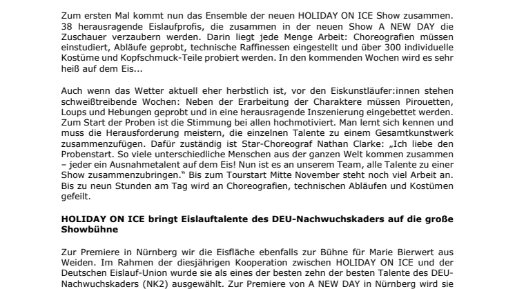 Zur Premiere in Nürnberg wir die Eisfläche ebenfalls zur Bühne für Marie Bierwert aus Weiden. Im Rahmen der diesjährigen Kooperation zwischen HOLIDAY ON ICE und der Deutschen Eislauf-Union wurde sie als eines der besten zehn der besten Talente des DEU-Nachwuchskaders (NK2) ausgewählt. Zur Premiere von A NEW DAY in Nürnberg wird sie auf der großen Eisbühne vor Publikum auftreten. Die Zwölfjährige trainiert beim EC Oberstdorf und wurde in diesem Jahr bereits Bayerische Jugend-Nachwuchsmeisterin sowie Vierte bei den Deutsche Nachwuchsmeisterschaften. Für ihren großen Auftritt in Nürnberg probt auch Marie aktuell an ihrer individuellen Choreografie, die sie den Zuschauer:innen am 15.12.2022 präsentieren wird.