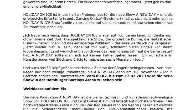 „Ich freue mich riesig, dass HOLIDAY ON ICE wieder auf Tour gehen kann. Ich denke noch oft an meine Zeit dort. Die spektakuläre Show, die großartige Bühne, die fantastischen Eislaufkünstler:innen und das einzigartige Publikum – das alles werde ich nie vergessen. „Jetzt wieder hier zu sein, bedeutet mir viel“, schwärmt Sarah Engels von ihrem Probenbesuch. „Es ist wirklich unglaublich was das Team dieses Jahr auf die Beine gestellt hat. A NEW DAY sollte man sich auf keinen Fall entgehen lassen. Ich wünsche allen Künstler:innen viel Glück und Erfolg für nächsten sechs Monate on tour.“
