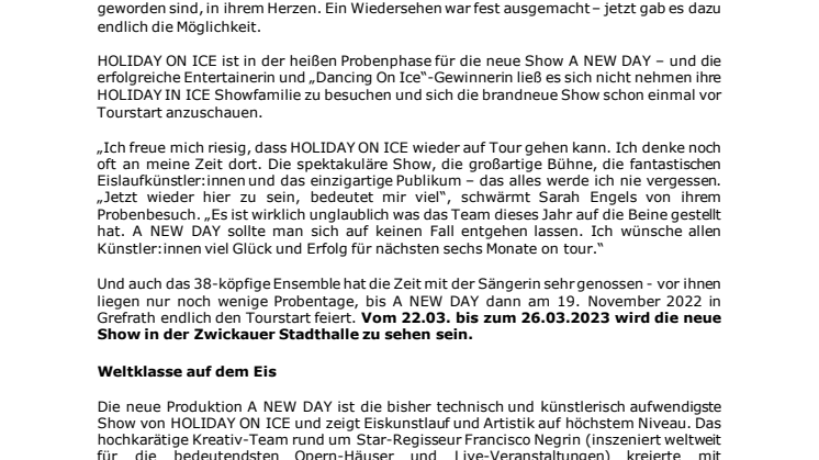 „Ich freue mich riesig, dass HOLIDAY ON ICE wieder auf Tour gehen kann. Ich denke noch oft an meine Zeit dort. Die spektakuläre Show, die großartige Bühne, die fantastischen Eislaufkünstler:innen und das einzigartige Publikum – das alles werde ich nie vergessen. „Jetzt wieder hier zu sein, bedeutet mir viel“, schwärmt Sarah Engels von ihrem Probenbesuch. „Es ist wirklich unglaublich was das Team dieses Jahr auf die Beine gestellt hat. A NEW DAY sollte man sich auf keinen Fall entgehen lassen. Ich wünsche allen Künstler:innen viel Glück und Erfolg für nächsten sechs Monate on tour.“