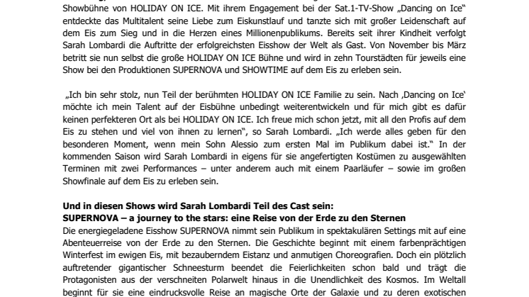 „Ich bin sehr stolz, nun Teil der berühmten HOLIDAY ON ICE Familie zu sein. Nach ‚Dancing on Ice‘ möchte ich mein Talent auf der Eisbühne unbedingt weiterentwickeln und für mich gibt es dafür keinen perfekteren Ort als bei HOLIDAY ON ICE. Ich freue mich schon jetzt, mit all den Profis auf dem Eis zu stehen und viel von ihnen zu lernen“, so Sarah Lombardi. „Ich werde alles geben für den besonderen Moment, wenn mein Sohn Alessio zum ersten Mal im Publikum dabei ist.“ In der kommenden Saison wird Sarah Lombardi in eigens für sie angefertigten Kostümen zu ausgewählten Terminen mit zwei Performances – unter anderem auch mit einem Paarläufer – sowie im großen Showfinale auf dem Eis zu erleben sein.