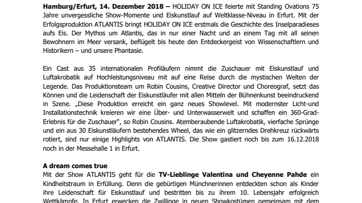 Mit der Show ATLANTIS geht für die TV-Lieblinge Valentina und Cheyenne Pahde ein Kindheitstraum in Erfüllung. Denn die gebürtigen Münchnerinnen entdeckten schon als Kinder ihre Leidenschaft für Eiskunstlauf und bestritten bis zu ihrem 10. Lebensjahr erfolgreich Wettkämpfe. In Erfurt erwecken die Zwillinge in neuen Showkostümen gemeinsam mit dem ATLANTIS Cast in der Über- und Unterwasserwelt sowie im Finale den Mythos um das legendäre Inselreich zum Leben und werden am 15.12.2018 um 15:30 Uhr zu sehen sein. „Wir freuen uns sehr, im 75. Jahr von HOLIDAY ON ICE dabei zu sein und gemeinsam mit dem Show-Cast, der uns in der letzten Saison so ans Herz gewachsen ist, den Mythos von Atlantis zu feiern“, erklärt Valentina Pahde begeistert, die in diesem Jahr ihren Traum vom Eiskunstlauf mit jungen Talenten teilen darf.