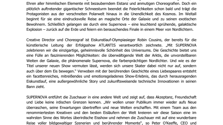 Creative Director und Choreograf ist Eiskunstlauf-Olympiasieger Robin Cousins, der bereits für die künstlerische Leitung der Erfolgsshow ATLANTIS verantwortlich zeichnete. „Mit SUPERNOVA zelebrieren wir die einzigartige, geheimnisvolle Schönheit des Universums. Die Geschichte bietet uns eine Fülle an faszinierenden Möglichkeiten: die überwältigende Welt der Arktis, die unvorstellbaren Weiten der Galaxie, die phänomenale Supernova, die farbenprächtigen Nordlichter. Und wie es der Titel unserer neuen Show vermuten lässt, werden sich unsere Skater dabei nicht nur auf, sondern auch über dem Eis bewegen.“ Verwoben mit der berührenden Geschichte eines Liebespaares entsteht ein facettenreiches, mitreißendes und emotionsgeladenes Show-Erlebnis, das durch herausragenden Eiskunstlauf, eine außergewöhnliche Story und zukunftsweisende technische Innovationen in seinen Bann zieht.