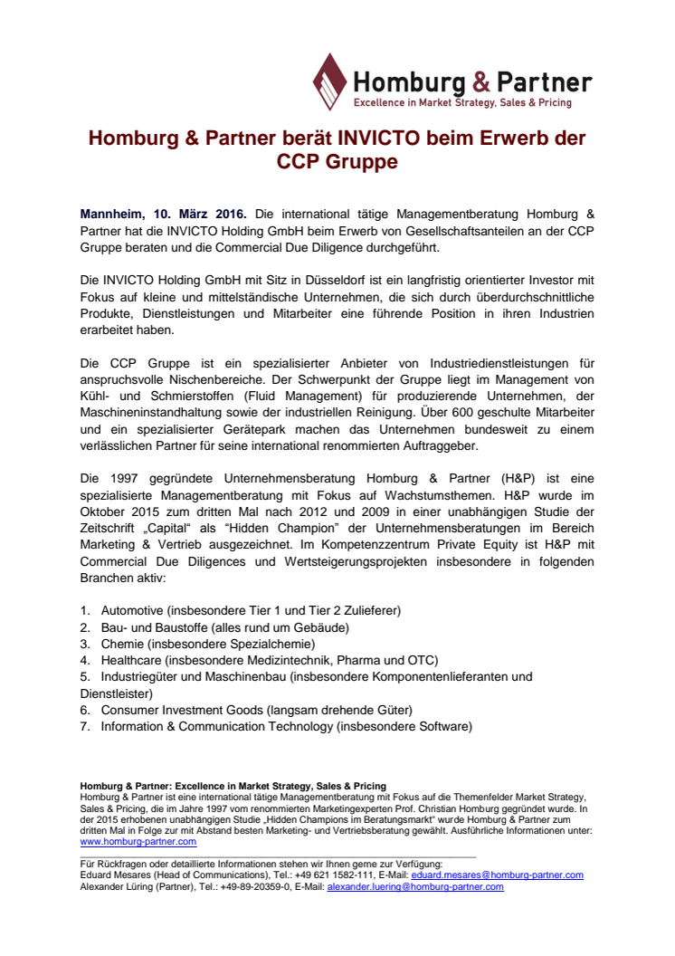 Mannheim, 10. März 2016. Die international tätige Managementberatung Homburg & Partner hat die INVICTO Holding GmbH beim Erwerb von Gesellschaftsanteilen an der CCP Gruppe beraten und die Commercial Due Diligence durchgeführt.
