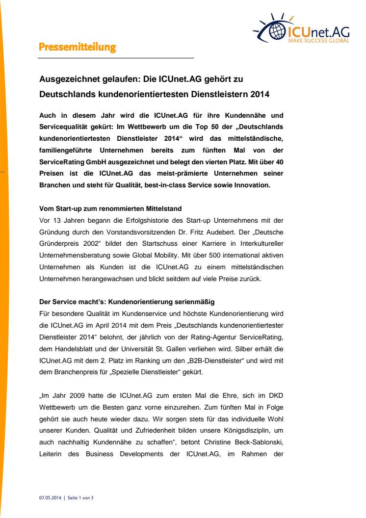 Ausgezeichnet gelaufen: Die ICUnet.AG gehört zu Deutschlands kundenorientiertesten Dienstleistern 2014
