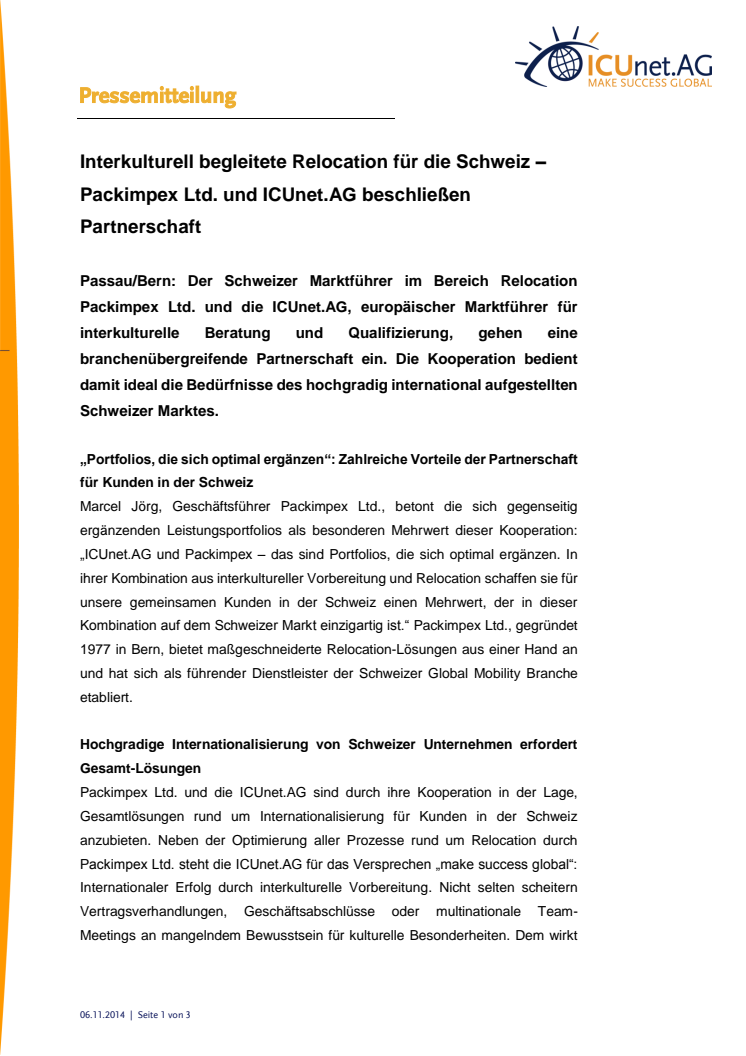 Passau/Bern: Der Schweizer Marktführer im Bereich Relocation Packimpex Ltd. und die ICUnet.AG, europäischer Marktführer für interkulturelle Beratung und Qualifizierung, gehen eine branchenübergreifende Partnerschaft ein. Die Kooperation bedient damit ideal die Bedürfnisse des hochgradig international aufgestellten Schweizer Marktes.