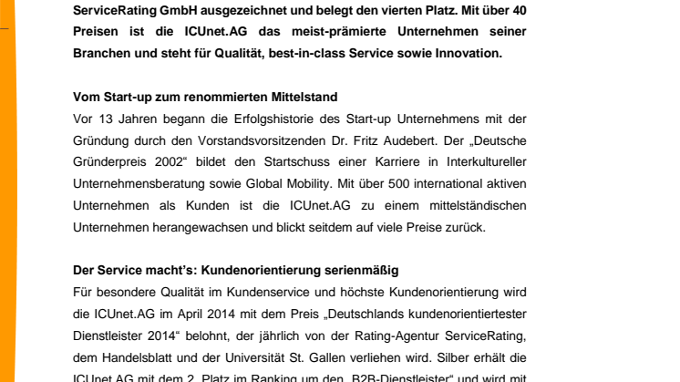 Auch in diesem Jahr wird die ICUnet.AG für ihre Kundennähe und Servicequalität gekürt: Im Wettbewerb um die Top 50 der „Deutschlands kundenorientiertesten Dienstleister 2014“ wird das mittelständische, familiengeführte Unternehmen bereits zum fünften Mal von der ServiceRating GmbH ausgezeichnet und belegt den vierten Platz. Mit über 40 Preisen ist die ICUnet.AG das meist-prämierte Unternehmen seiner Branchen und steht für Qualität, best-in-class Service sowie Innovation.