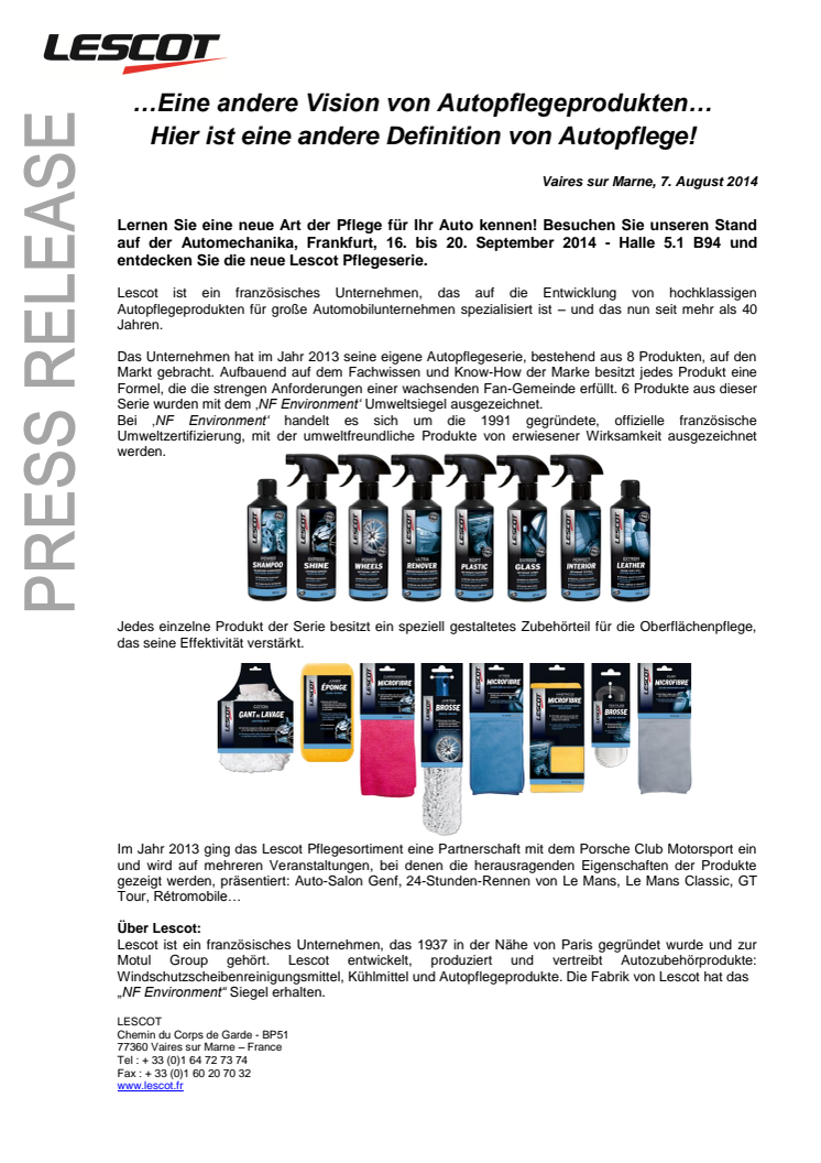Lernen Sie eine neue Art der Pflege für Ihr Auto kennen! Besuchen Sie unseren Stand auf der Automechanika, Frankfurt, 16. bis 20. September 2014 - Halle 5.1 B94 und entdecken Sie die neue Lescot Pflegeserie.