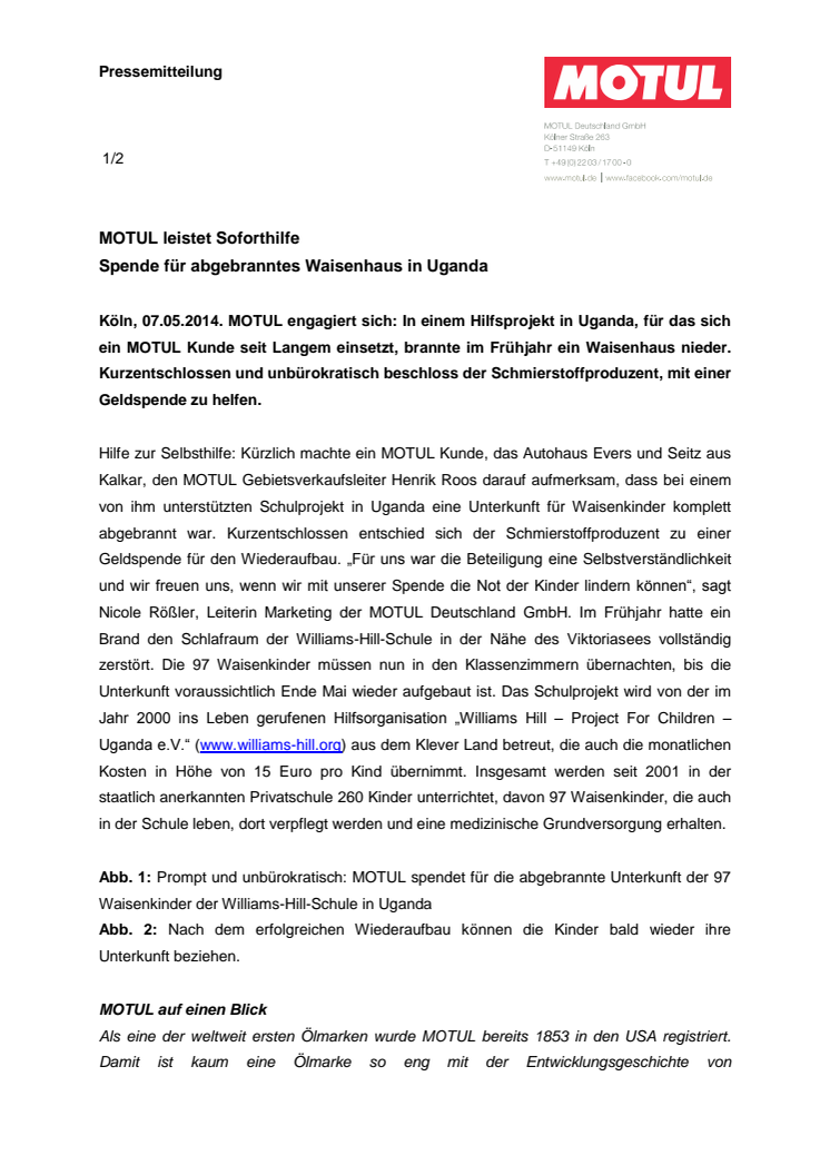 In einem Hilfsprojekt in Uganda, für das sich ein MOTUL Kunde seit Langem einsetzt, brannte im Frühjahr ein Waisenhaus nieder. Kurzentschlossen und unbürokratisch beschloss der Schmierstoffproduzent, mit einer Geldspende zu helfen.