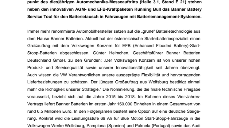 Immer mehr renommierte Automobilhersteller setzen auf die „grüne“ Batterietechnologie aus dem Hause Banner Batterien. Aktuell hat der österreichische Starterbatteriespezialist einen Großauftrag mit dem Volkswagen Konzern für EFB (Enhanced Flooded Battery)-Start-Stopp-Batterien abgeschlossen. Günter Helmchen, Geschäftsführer Banner Batterien Deutschland GmbH, zu den Gründen: „Der Volkswagen Konzern ist von unserer hohen Produkt- und Servicequalität sowie unserer Innovationsfähigkeit seit Jahren überzeugt. Auch wissen die VW Verantwortlichen unsere ausgeprägte Flexibilität und hervorragenden Lieferbeziehungen zu schätzen. Der jüngste Großauftrag aus Wolfsburg bestätigt einmal mehr die Richtigkeit unserer Strategie.“ Die Nominierung, die die finale technische Freigabe voraussetzt, bezieht sich auf die Jahre 2015 bis 2018. Im Rahmen dieses Vier-Jahres-Vertrags liefert Banner Batterien im ersten Jahr 150.000 Einheiten in einem Gesamtwert von rund 6,5 Millionen Euro. In den Folgenjahren besteht eine Option auf eine deutliche Steigerung. Konkret wird die Leistungsstufe 69 Ah für Blue Motion Start-Stopp-Fahrzeuge in die Volkswagen Werke Wolfsburg, Pamplona (Spanien) und Palmela (Portugal) sowie das Audi Werk in Györ (Ungarn) und das Seat Werk in Martorell (Spanien) geliefert.