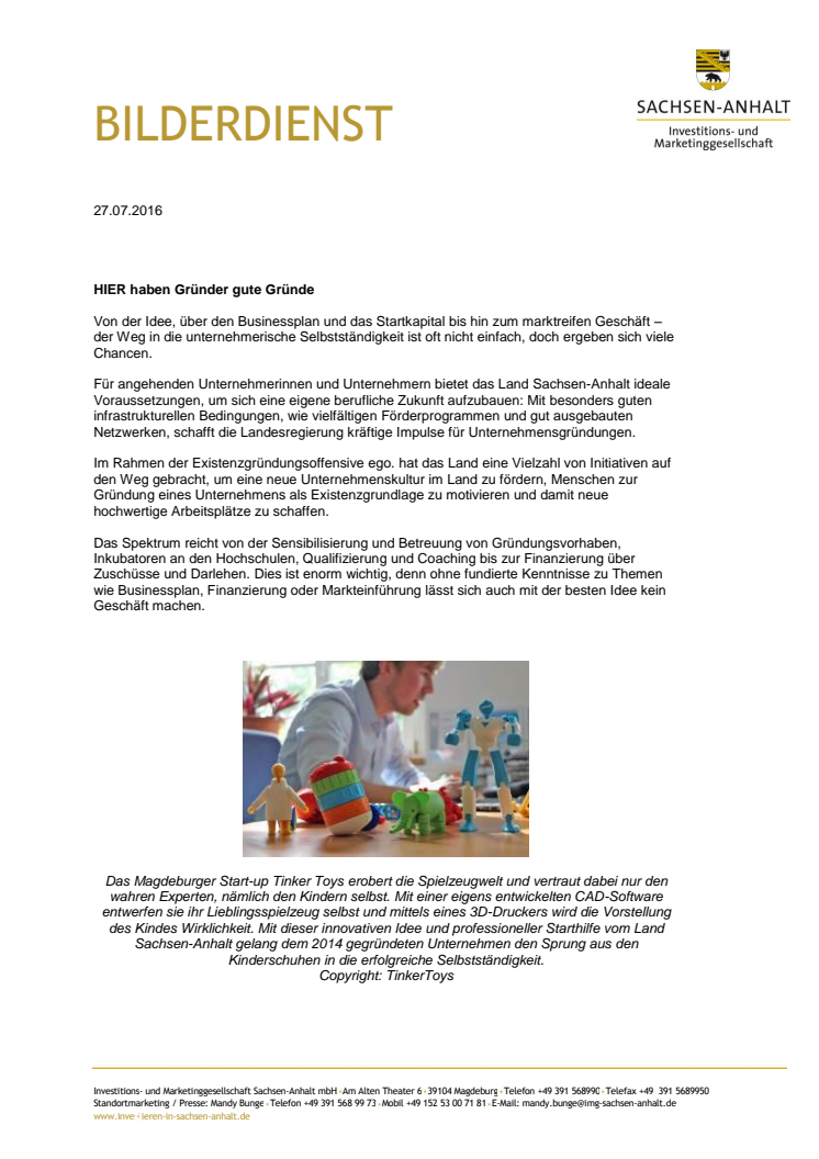 Für angehenden Unternehmerinnen und Unternehmern bietet das Land Sachsen-Anhalt ideale Voraussetzungen, um sich eine eigene berufliche Zukunft aufzubauen: Mit besonders guten infrastrukturellen Bedingungen, wie vielfältigen Förderprogrammen und gut ausgebauten Netzwerken, schafft die Landesregierung kräftige Impulse für Unternehmensgründungen.