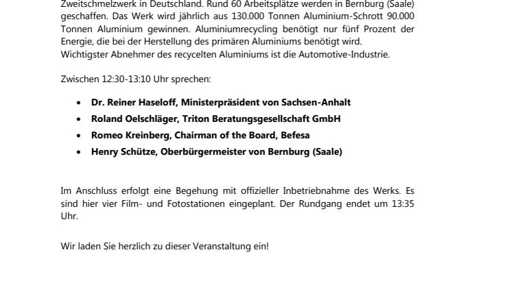 Der Ministerpräsident von Sachsen-Anhalt, Dr. Reiner Haseloff, eröffnet am 3. Dezember 2014 gemeinsam mit Roland Oelschläger (CEO Befesa-Eigentümer Triton), Javier Molina (CEO Befesa), Romeo Kreinberg (CoB Befesa) und dem Oberbürgermeister von Bernburg (Saale), Henry Schütze, Befesas erstes Aluminium-Zweitschmelzwerk in Deutschland.