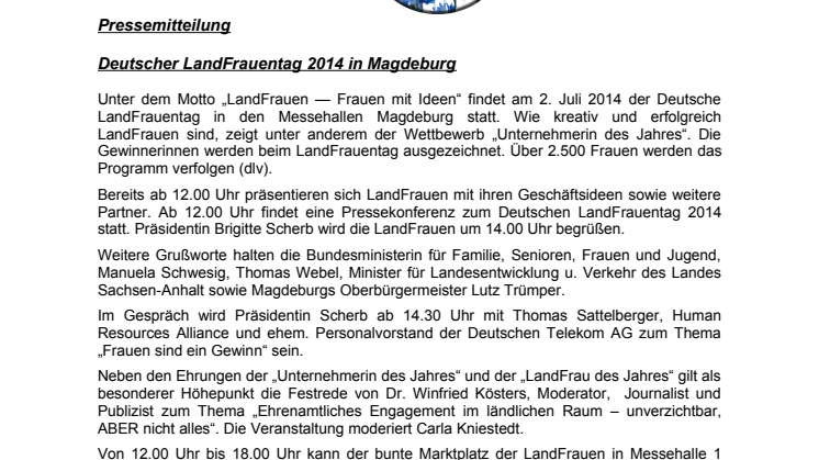Partner. Ab 12.00 Uhr findet eine Pressekonferenz zum Deutschen LandFrauentag 2014