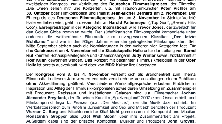 30. Oktober oder Filmkomponist und Pianist Jean-Michel Bernard am 2. November. Der Ehrenpreis des Deutschen Filmmusikpreises, der am 3. November im Steintor-Varieté Halle verliehen wird, geht in diesem Jahr an Harold Faltermeyer („Top Gun“, „Beverly Hills Cop“). Ehrenpreisträger in der Kategorie International wird Trevor Jones, der zweifach für den Golden Globe nominiert wurde. Der südafrikanische Filmkomponist komponierte unter anderem die weltberühmte Filmmusik zum unvergessenen Klassiker „Der letzte Mohikaner“ und war in den 90iger Jahren einer der gefragtesten Filmkomponisten. Seit Mitte September stehen auch die Nominierungen in den weiteren vier Kategorien fest. Für das Galakonzert am 4. November mit der Staatskapelle Halle unter der Leitung von Bernd Ruf konnten Schauspielerlegende und Chansonsängerin Judy Winter sowie Jazzklarinettist Rolf Kühn gewonnen werden. Das Konzert mit bekannten Filmmusikmelodien in der Oper Halle ist bereits ausverkauft, wird aber von MDR Kultur live übertragen.