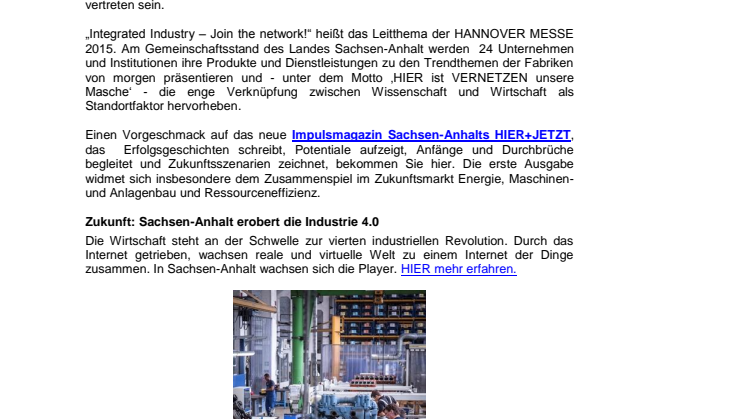 Einen Vorgeschmack auf das neue Impulsmagazin Sachsen-Anhalts HIER+JETZT, dasErfolgsgeschichten schreibt, Potentiale aufzeigt, Anfänge und Durchbrüche begleitet und Zukunftsszenarien zeichnet, bekommen Sie hier. Die erste Ausgabe widmet sich insbesondere dem Zusammenspiel im Zukunftsmarkt Energie, Maschinen- und Anlagenbau und Ressourceneffizienz.